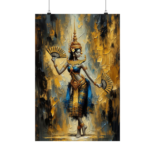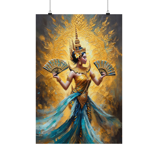 Matte Poster - Cambodian Blue and Gold Apsara Dancer with Fans Print - Traditional Modern Khmer Art on Matte Poster